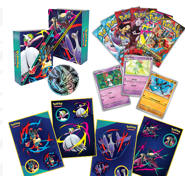Contents: 6 Pokémon TCG booster packs 3 foil cards featuring Ralts, Kirlia, and Riolu 1 Pokémon coin featuring Mega Lucario 4 colorful sticker sheets A mini portfolio to store your favorite cards