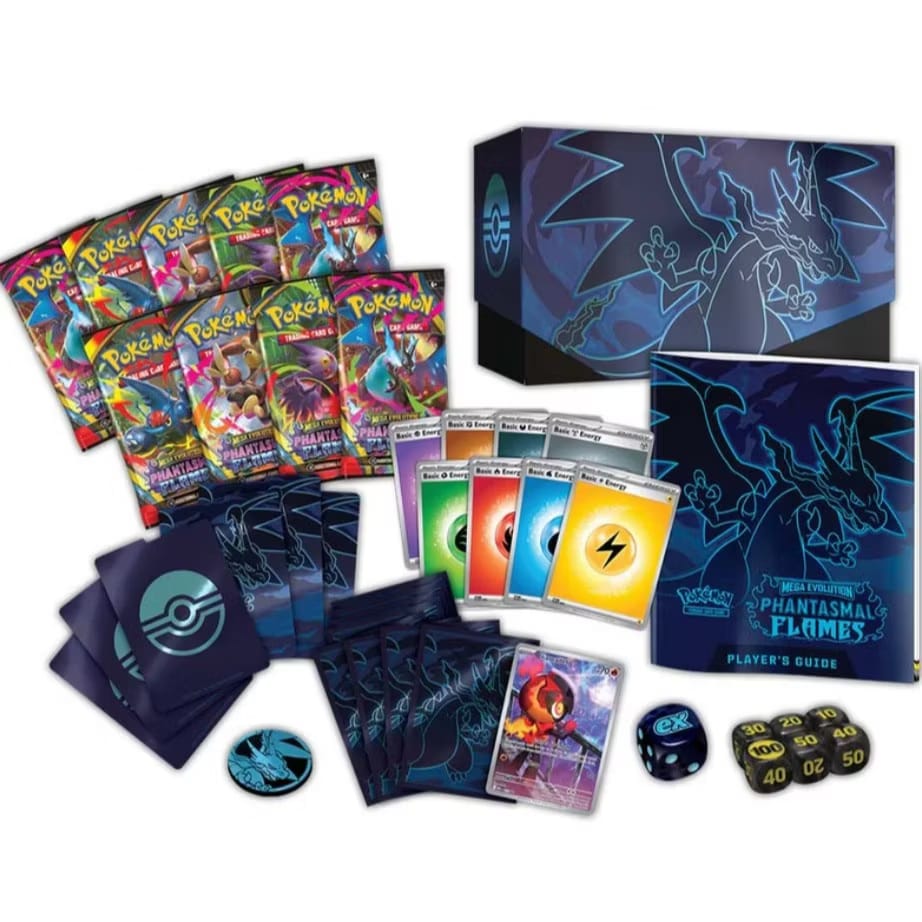 Content: The Pokémon TCG: Mega Evolution—Phantasmal Flames Pokémon Center Elite Trainer Box includes: 11 Pokémon TCG: Mega Evolution—Phantasmal Flames booster packs Each booster pack contains 10 cards, 1 Basic Energy, and 1 Pokémon TCG Live code card. Cards vary by pack. 1 full-art foil promo card featuring Charcadet with a Pokémon Center logo 1 full-art foil promo card featuring Charcadet 65 card sleeves 40 Pokémon TCG Energy cards A player’s guide to the Mega Evolution—Phantasmal Flames expansion 6 damage-counter dice 1 competition-legal coin-flip die 1 plastic coin A collector’s box to hold everything, with 6 dividers to keep it organized A code card for Pokémon Trading Card Game Live
