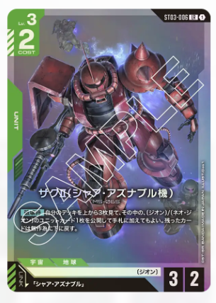 [When destroyed] You can look at 3 cards in your deck from the top and reveal 1 [Zeon]/[Neo Zeon] unit card in it and add it to your hand. The remaining cards are randomly put down.